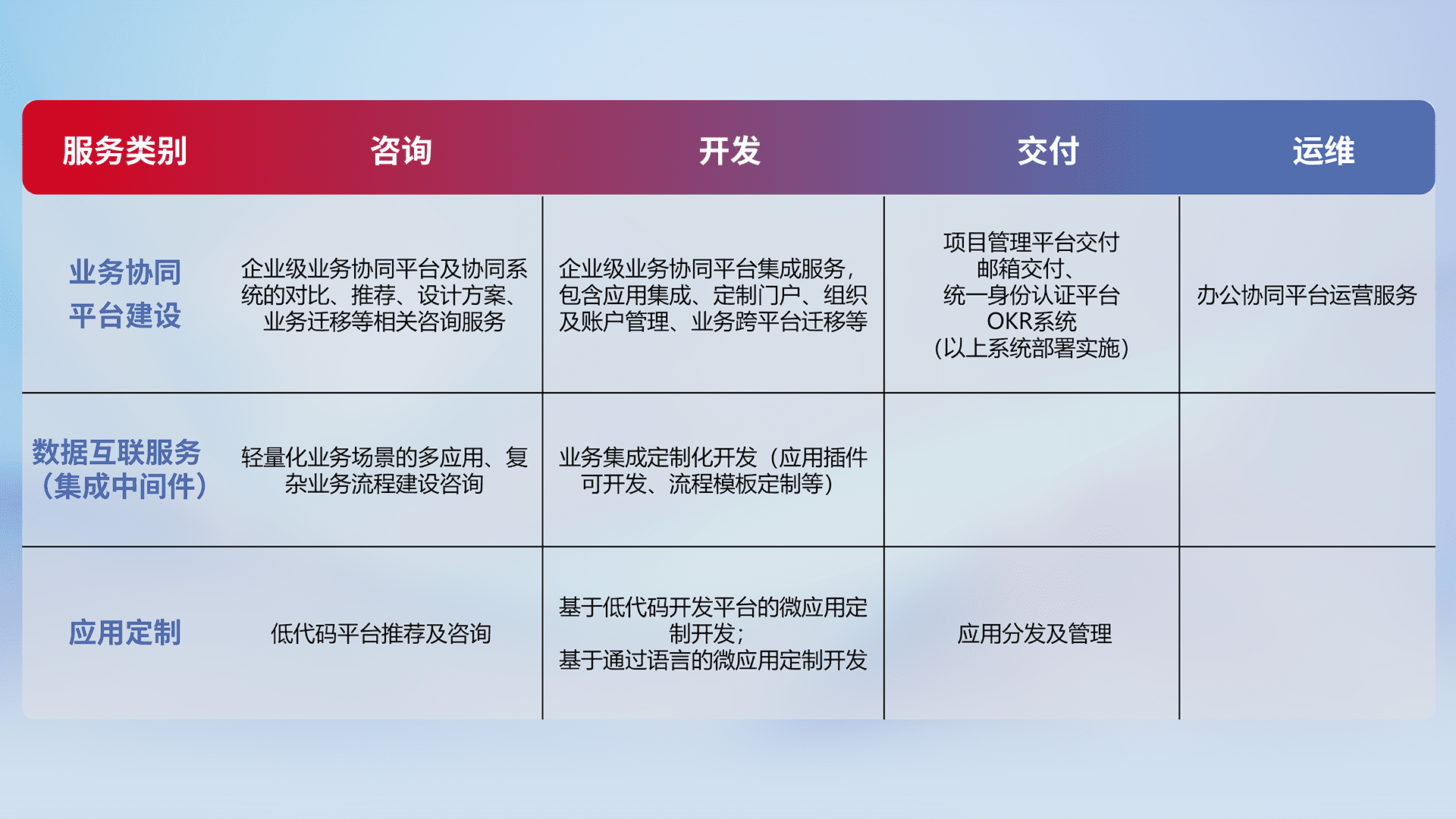 针对钉钉、、企微、、、、IDaas等平台级产品提供产品的规划、、方案、、交付、、、定制化开发等服务,,,实现如统一协同办公、、、、智能客户服务、、、混合会议管理、、、、智能数据查询、、、、等业务场景,,实现数字化转型。。。